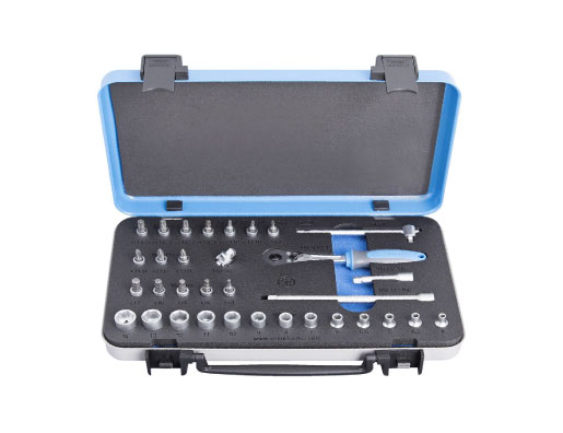 Juego de vasos, puntas y accesorios de 1/4″ en caja plástica, 36 piezas: